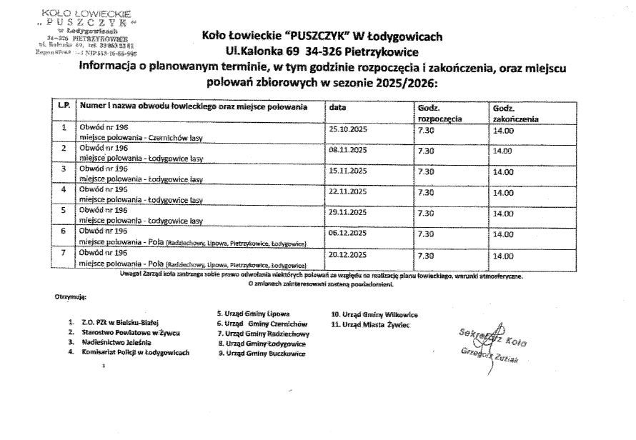 Na podstawie art. 42ab ust. 2 ustawy z dnia 13 października 1995 r. Prawo łowieckie (t.j. Dz. U. z 2025r. poz. 539) podaje w załączeniu do publicznej wiadomości kalendarz polowań zbiorowych Koła Łowieckiego „Puszczyk” w Łodygowicach w sezonie 2025/2026.