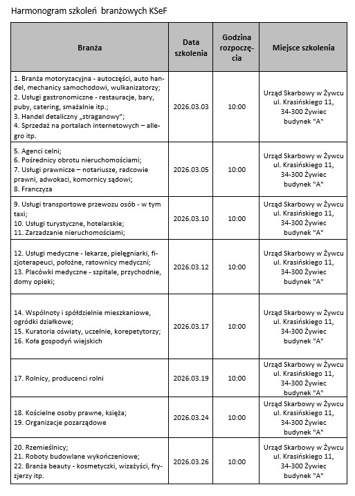 Aby wesprzeć przedsiębiorców w przygotowaniu do nowych przepisów, Urząd Skarbowy w Żywcu organizuje w marcu 2026 r. stacjonarne spotkania informacyjne „KSeF – szkolenia dla branży”, dedykowane przedstawicielom 22 branż.