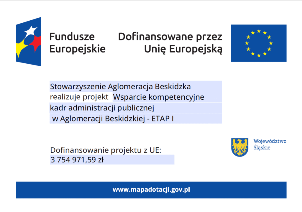 Wsparcie kompetencyjne kadr administracji publicznej w Aglomeracji Beskidzkiej – ETAP 1 Stowarzyszenie Aglomeracja Beskidzka pozyskało dofinansowanie w wysokości 3 754 971,59 PLN na realizację projektu „Wsparcie kompetencyjne kadr administracji publicznej w Aglomeracji Beskidzkiej – ETAP 1”. Projekt będzie współfinansowany ze środków Europejskiego Funduszu Społecznego Plus w ramach Programu Fundusze Europejskie dla Śląskiego 2021-2027 w ramach działania 5.14. Usługi rozwojowe dla kadr administracji samorządowej (typ projektu nr 1). Całkowita wartość projektu to 4 417 613,64 PLN.